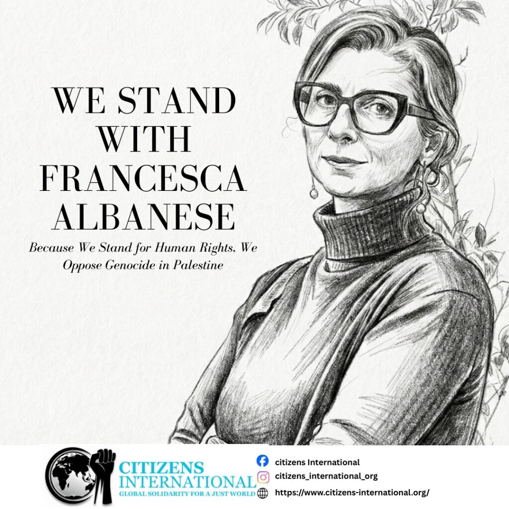 We at Citizens International stand with Francesca Albanese. Her works are grounded in evidence, rooted in international law, uncompromising in its commitment to truth, and a powerful manifestation of what the UN should be: a space where power is held to account and the law is not merely decorative.